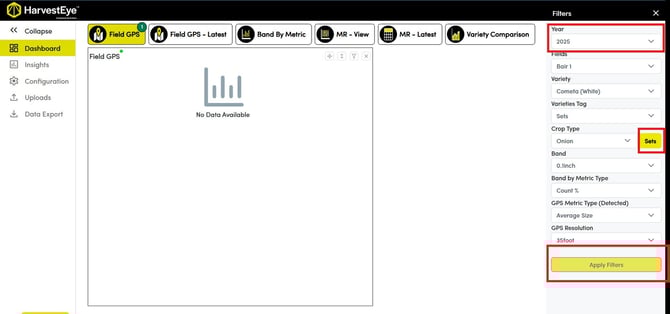 If you can only see data from the previous year on your HarvestEye portal, it’s likely that your filters need updating. Follow the steps below to make sure your dashboard is displaying the current season’s data.